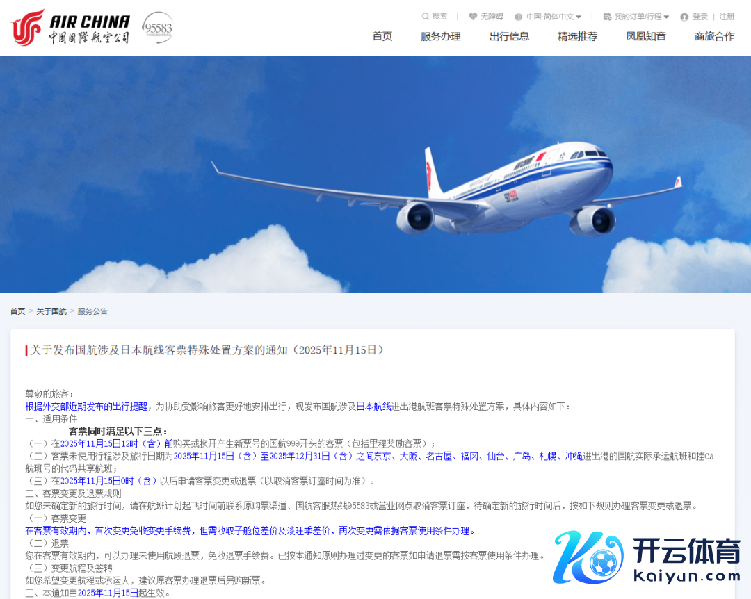 国航在奉告中明确,关于在本年11月15日12时(含)前购买或换开产生新票号的国航999开端的客票(包括里程奖励客票);客票未使用行程波及旅行日历为2025年11月15日(含)至2025年12月31日(含)之间东京、大阪、名古屋、福冈、仙台、广岛、札幌、冲绳收支港的国航实质承运航班和挂CA航班号的代码分享航班;在2025年11月15日0时(含)以后申宴客票变更或退票(以取消客票订座手艺为准)。在客票有用期内,初度变更免收变更手续费,但需收取子舱位差价及淡旺季差价,再次变更需依据客票使用条目办理。在客票有用期内,不错办理未使用航段退票,免收退票手续费。