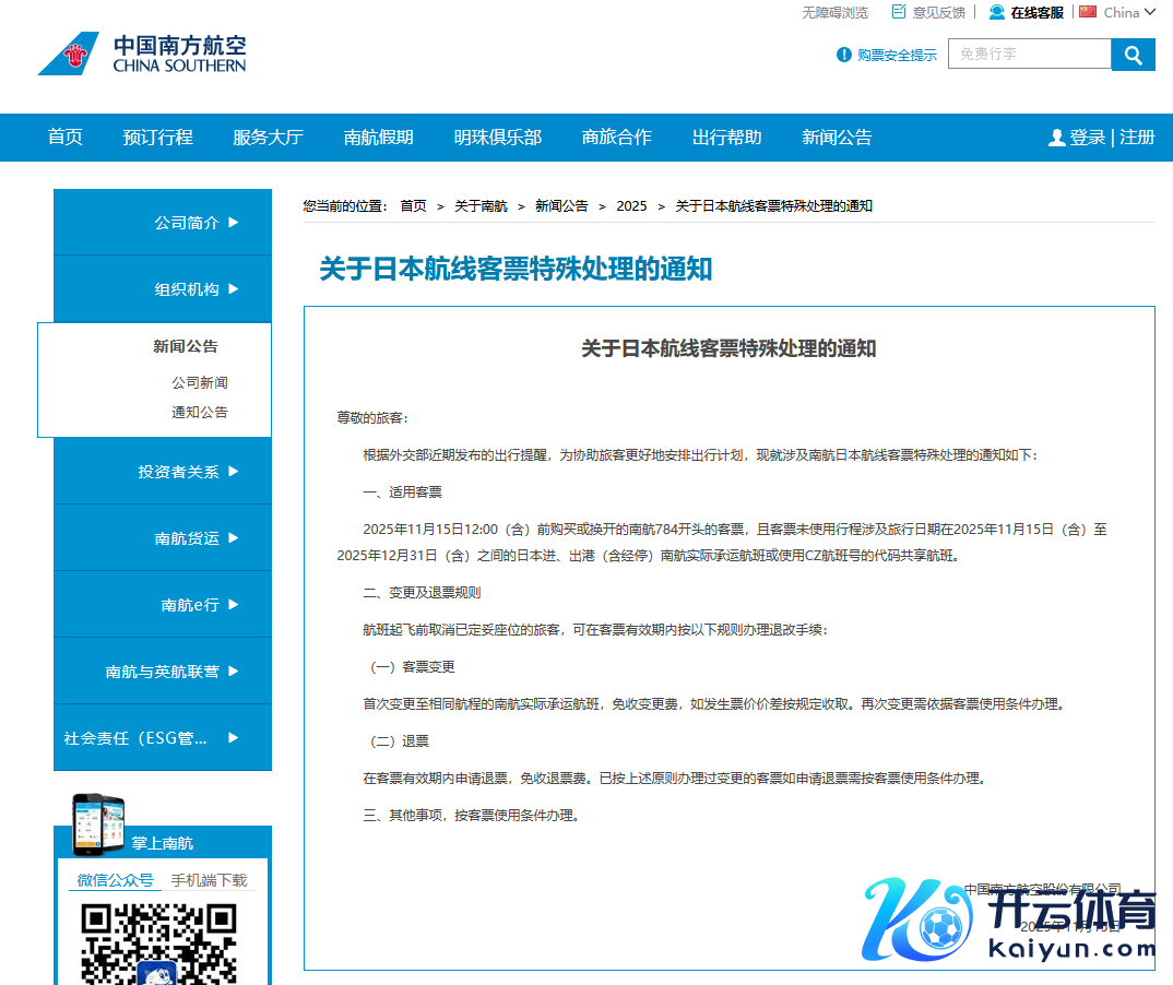 南航在奉告中明确,关于在本年11月15日12:00(含)前购买或换开的南航784开端的客票,且客票未使用行程波及旅行日历在2025年11月15日(含)至2025年12月31日(含)之间的日本进、出港(含经停)南航实质承运航班或使用CZ航班号的代码分享航班,航班升空前取消已定妥座位的游客,在客票有用期内央求退票,免收退票费。初度变更至换取航程的南航实质承运航班,免收变更费,如发生票价价差按纪律收取。