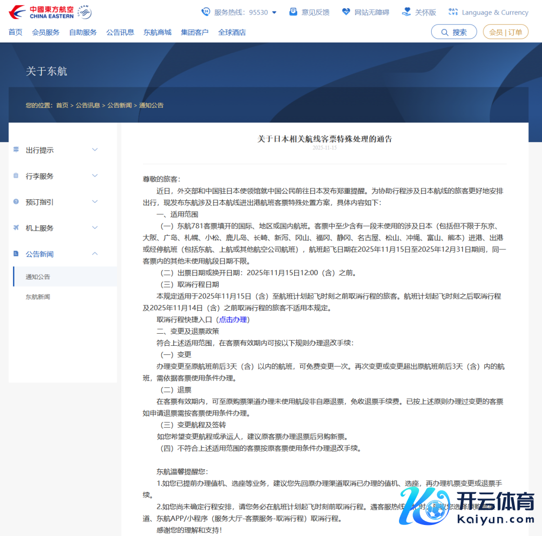 东航在奉告中明确,关于在本年11月15日12:00(含)前购买或换开的东航781客票填开的国外、地区或国内航班。客票中至少含有一段未使用的波及日本(包括但不限于东京、大阪、广岛、札幌、小松、鹿儿岛、长崎、新泻、冈山、福冈、静冈、名古屋、松山、冲绳、富山、熊本)进港、出港或经停航班(包括东航、上航或其他航空公司航班),航班升空日历在2025年11月15日至2025年12月31日历间,团结客票内的其他未使用航段日历不限。办理变更至原航班前后3天(含)以内的航班,可免费变更一次。再次变更或变更超出原航班前后3天(含)内的航班,需依据客票使用条目办理。在客票有用期内,可至原购票渠谈办理未使用航段非自发退票,免收退票手续费。