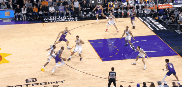 之后库明加在弧顶,库里回传给他,坐窝跑位接近,库明加应该第一时分回传给他,但停了一下,太阳坐窝夹攻,库明加差点造作,迅速传了另一侧。