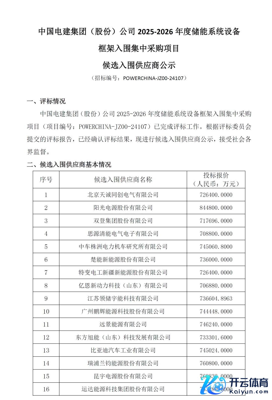 1月9日开云体育(中国)官方网站,中国电建集团(股份)公司2025-2026年度储能系统配置框架采购中标候选东谈主公布。
