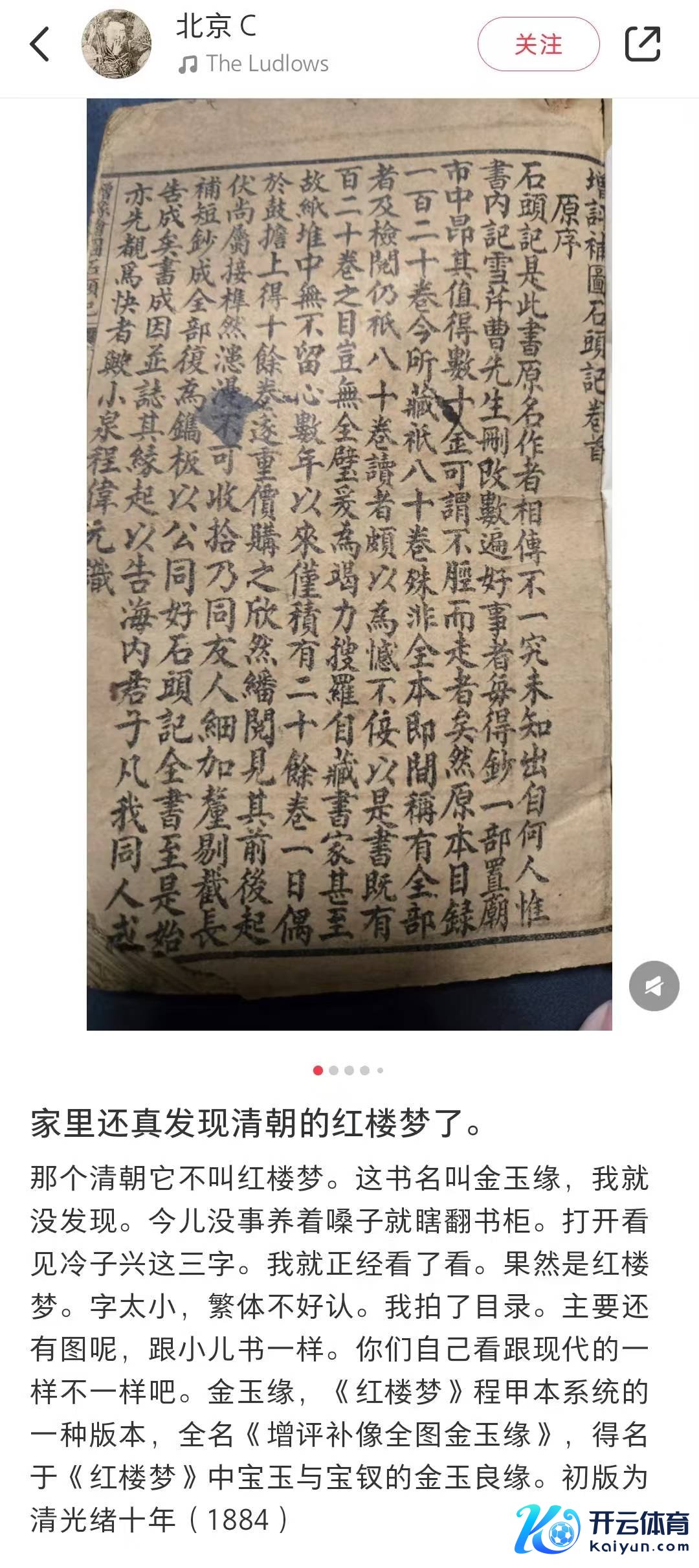 本年一月,小红书博主“北京C”发帖称我方在家中发现了一册清朝的《红楼梦》开云(中国)kaiyun网页版登录入口,并晒出了这本古籍的像片,这本书不叫《红楼梦》而叫《增评补像全图金玉缘》,第一版于清光绪十年(1884)年。