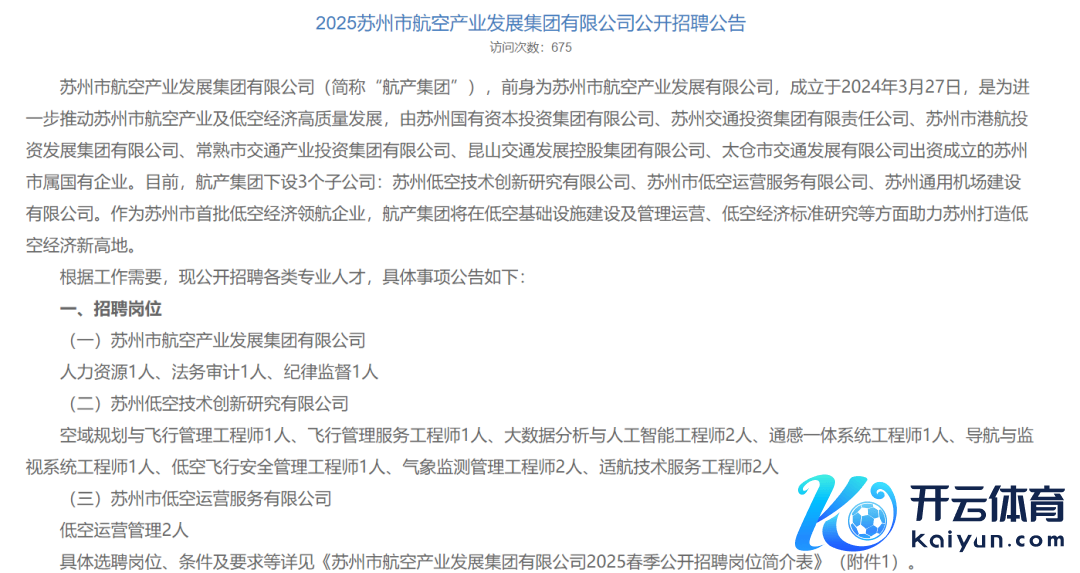 苏州市航空产业发展集团有限公司近日发布公开招聘公告,集团本部和子公司苏州低空期间翻新连系有限公司、苏州市低空运营处事有限公司区别招聘各样专科东说念主才。其中,苏州市低空运营处事有限公司招聘低空运营措置2东说念主,苏州低空期间翻新连系有限公司放出了低空遨游安全措置工程师、空域决议与遨游措置工程师、遨游措置处事工程师、适航期间处事工程师等一批岗亭。