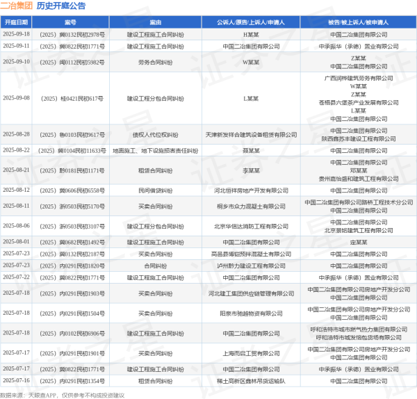 本站音书,凭证天眼查APP暴露,近日公布了一则中国二冶集团有限公司当作被告/被上诉东说念主的开庭公告,防护现实如下: 案号:(2025)冀0606民初6558号审理法院:保定市莲池区东说念主民法院案由:民间假贷纠纷当事东说念主信息:原告/上诉东说念主:河北恒祥房地产开荒有限公司被告/被上诉东说念主:中国二冶集团有限公司开庭日历:2025年8月12日 凭证统计,近一年内以中国二冶集团有限公司为当事东说念主的历史开庭公告有469则,其中案由为“生意协议纠纷”的公告以128则居首,......【更多...】