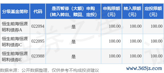 本站音信,8月16日恒生前海基金责罚有限公司发布《恒生前海恒源昭利债券型证券投资基金暂停大额申购(疗养转入、按期定额投资)业务的公告》。公告中辅导,为了保证基金的隆重运作,保护基金份额抓有东谈主利益,自2025年8月18日起恒生前海恒源昭利债券型证券投资基金暂停大额申购(疗养转入、按期定额投资)业务,下属分级基金疗养明细如下: 注:本基金暂停大额申购(疗养转入、按期定额投资)业务时间,本基金的开户、申购、赎回、疗养转出等其它业务仍照常办理。 以上本色为本站据公开信息整理,由A......【更多...】