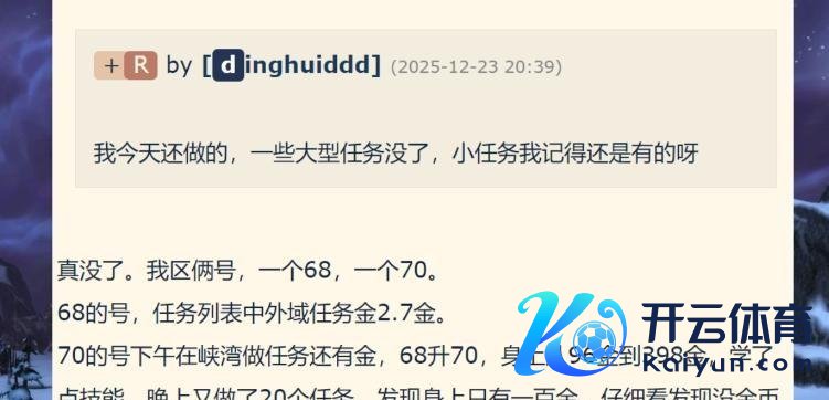 发帖的那位老哥说,他68级在诺森德吭哧吭哧作念任务,作念完民风性一看奖励栏诶,金币那栏空了。一运行还以为我方目眩了,仔细说明后发现,照实没给金币。这帖子一出来,不少玩家齐跑去测试,反馈追想的情况大差不差,至少有些任务是真实不给金币了。