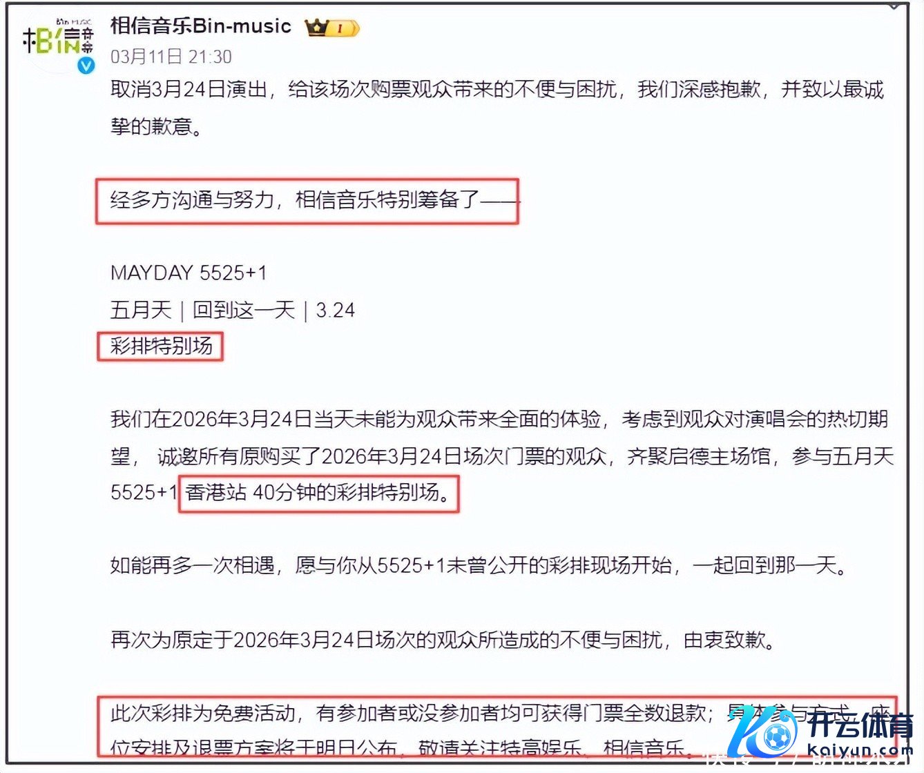 先来看五月天的回报,坚信音乐发文暗示给退票的不雅众致歉,历程多方换取与勤奋接头了“40分钟的免费彩排特殊场”,安排技术是3月24日(原定的演唱会日历),无论参预与否王人可取得门票全数退款,贵重决议稍后公开。
